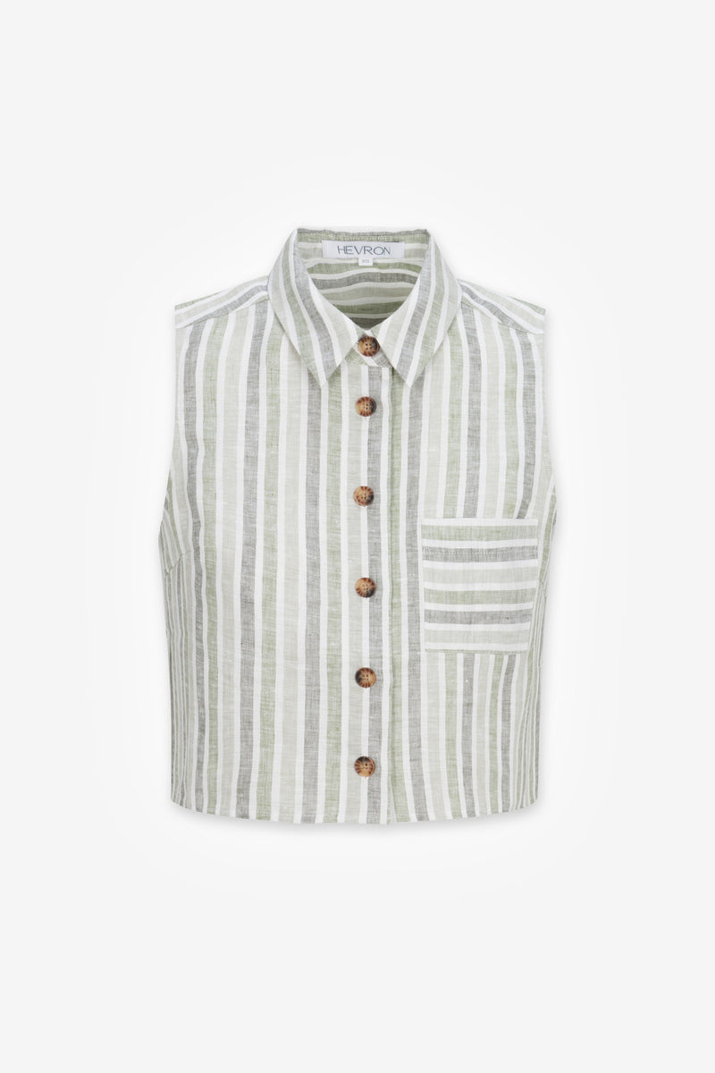 Designed in our signature 100% linen, the Katja Top pairs a sleeveless, boxy, yet not oversized silhouette with a crisp fold collar. Center front buttons and a soft hemline accent the cropped piece.